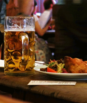 烤猪肘是著名的德国特色美食。传统的猪肘做法是先用啤酒和盐腌制并抓揉猪肘使入味,然后先蒸再烤。这样既去除了油脂,又保留了猪肘的胶质和水分。猪肘的表皮酥脆口感,而且里头的肉软嫩又不油腻,肉质鲜美、松软多汁。搭配德国的酸菜,相当的美味。在品猪肘的同时,配以慕尼黑黑啤,别有一番风味。