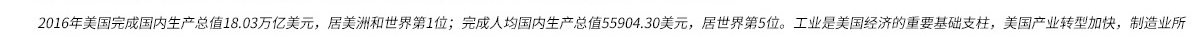 2016年美国完成国内生产总值18.03万亿美元,居美洲和世界第1位;完成人均国内生产总值55904.30美元,居世界第5位。工业是美国经济的重要基础支柱,美国产业转型加快,制造业所占比重呈下降趋势,劳动密集型产业进一步被淘汰或转移到国外。