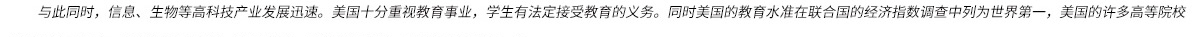 与此同时,信息、生物等高科技产业发展迅速。美国十分重视教育事业,学生有法定接受教育的义务。同时美国的教育水准在联合国的经济指数调查中列为世界第一,美国的许多高等院校有非常大竞争力,包括斯坦福大学、耶鲁大学、麻省理工学院、哥伦比亚大学等。